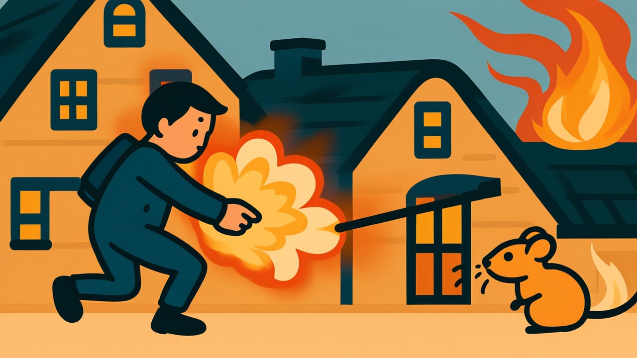 The literal image is clear and striking. Someone has mice in their house. Instead of using traps or calling an exterminator, they decide to burn down the entire building. The mice would certainly leave, but the person would lose everything they own. This extreme action creates a much bigger problem than the original issue.