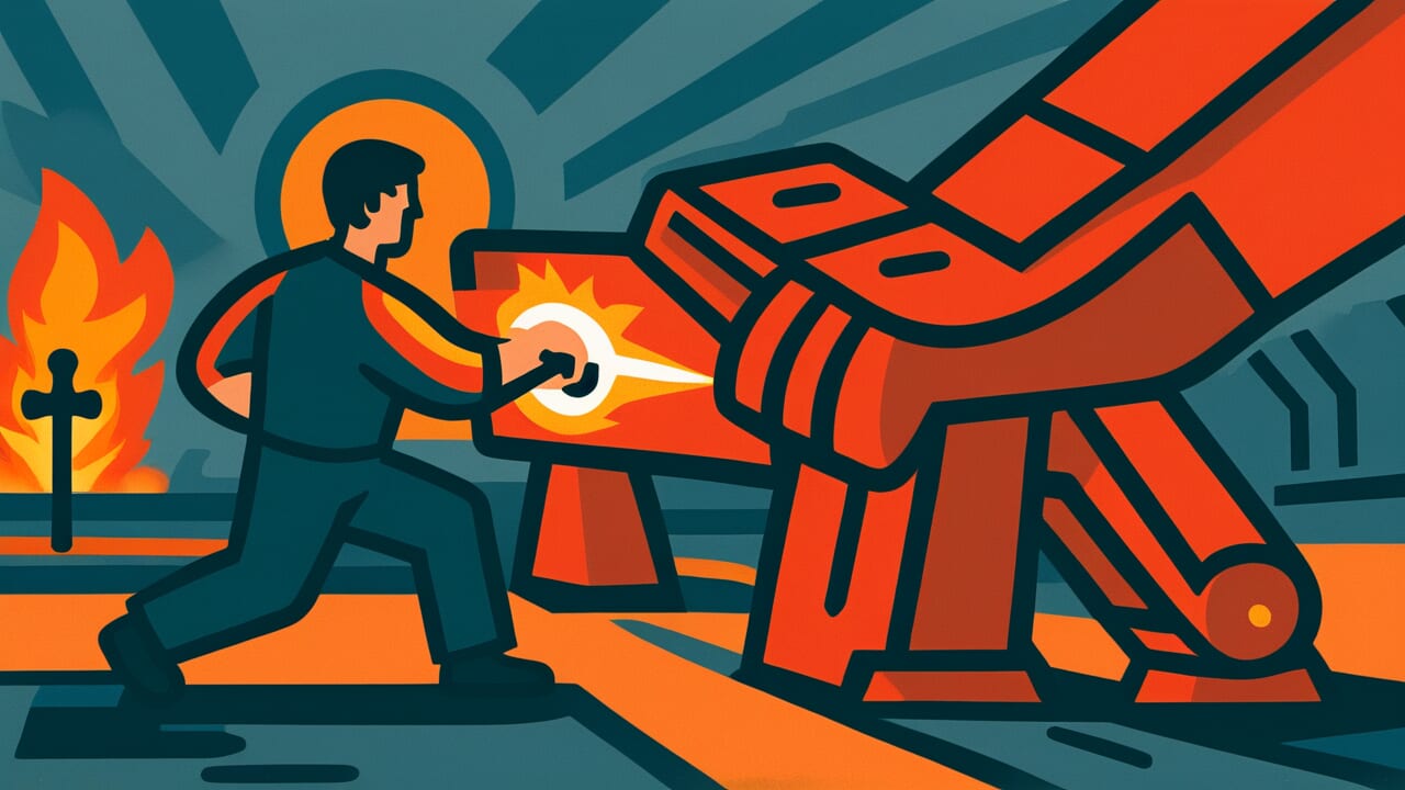 A palavra “strike” (bater) neste contexto significa golpear com um martelo, não parar de trabalhar. Ferreiros literalmente batem no ferro quente com martelos pesados para dar forma. A frase usa aliteração com “strike” e “iron”, tornando-a mais fácil de lembrar e repetir.
