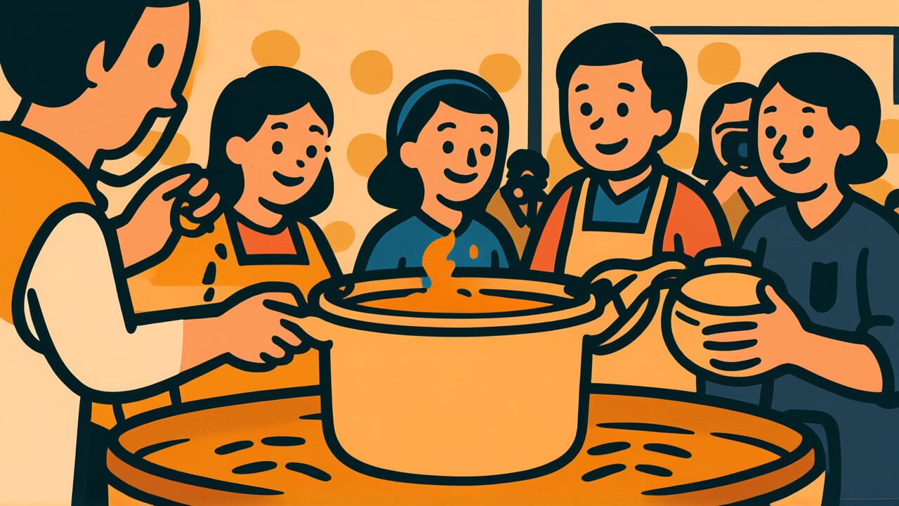 Cada pessoa adicionando ao caldo acredita que seu ingrediente o melhora. Mas elas não podem provar o que outros adicionaram antes delas. Sua adição “perfeita” entra em conflito com a escolha “perfeita” de outra pessoa. O resultado final não agrada ninguém porque combina ideias conflitantes de bom gosto.